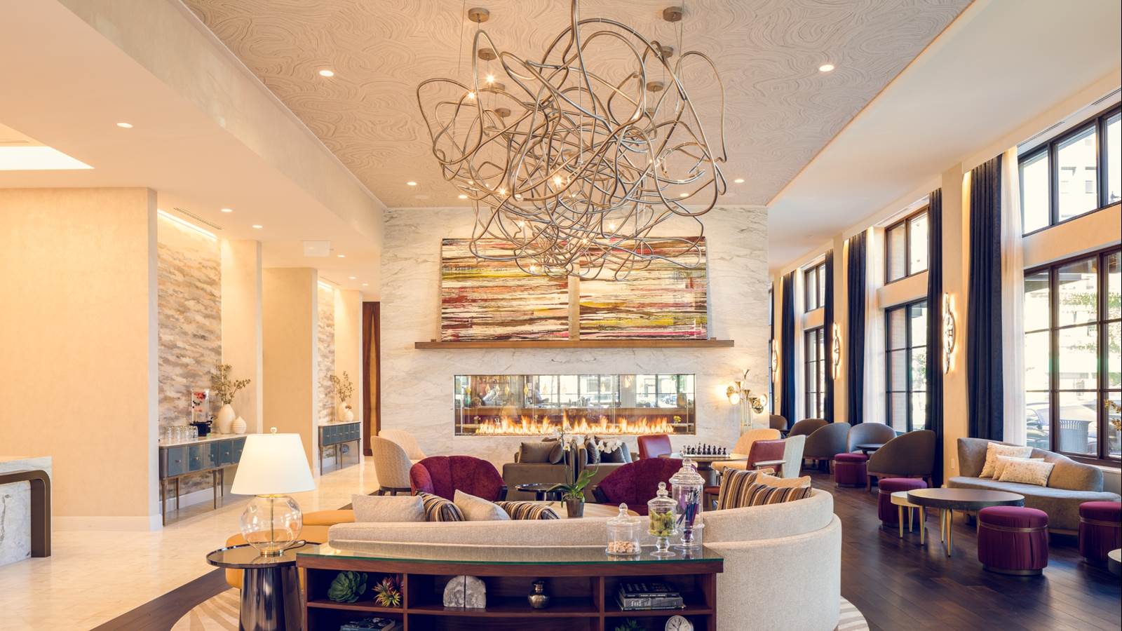 [music] a soft color palette and sinuous forms incite community and warmth with lounge style seating and double-sided fireplace in the lobby.