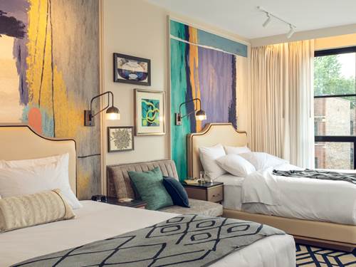 Our modernly appointed deluxe double queen rooms infuse the community's academic and artistic contributions that inspire today's Hyde Park. Each deluxe double queen room offers hardwood flooring throughout, love seat and ottoman, full-length wardrobe, 55-inch flat screen TV, executive desk and chair with charging station. Sleeping space offers two queen beds with premium linens and plush pillows. Bluetooth alarm clock and blackout drapes. Generously sized marble tiled bathroom offers a large walk-in shower, single vanity, and luxury bath products. Accessible Rooms and connecting rooms upon request. These rooms sleep four guests.